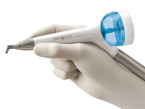 The first dual purpose air polisher that connects directly to the air turbine of virtually any dental chair. The Air-n-Go works as an effective supragingival air polisher for prophylaxis and perfect cosmetic results. With the addition of the optional Air-n-Go Perio Kit, which includes an ultra-fine Perio nozzle, a green Perio powder tank and Perio powder, the handpiece converts to a device capable of subgingival care of the tooth or the implant for in-depth bacterial removal.