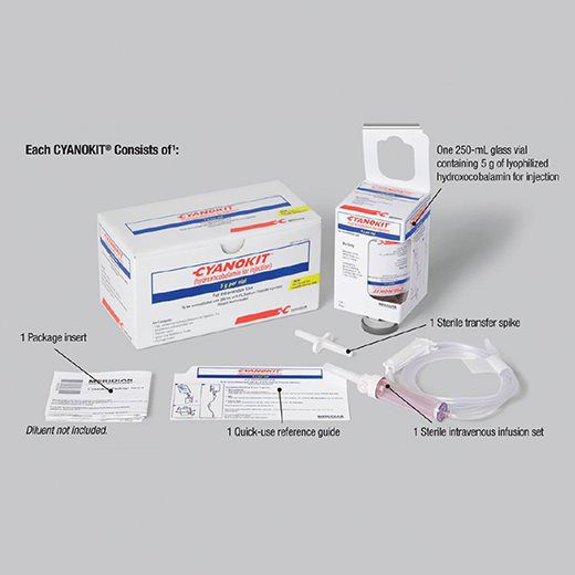 CYANOKIT® (hydroxocobalamin for injection) 5g. Indication: For the treatment of known or suspected cyanide poisoning. If clinical suspicion of cyanide poisoning is high, CYANOKIT® should be administered without delay.
