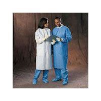 Protective, 3-layer fabric for light to medium fluid contact. Features knit collar and cuffs, 5 snaps, 3 reinforced pockets, neck loop for hanging, size/name label. White.