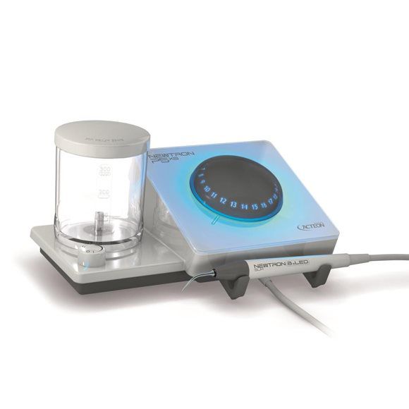 Piezo Ultrasonic Device with Autoclavable B.LED Handpiece and Irrigation Tank. Part of the PURE NEWTRON range of redesigned ultrasonic devices by ACTEON featuring Cruise Control for the most powerful, smoothest performance available in ultrasonics. Includes the device and Newtron Slim B.LED Handpiece.
